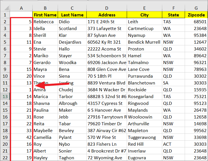 The rows will rearrange according to the numbers you've assigned. Once sorted, you can delete the temporary numbering column.