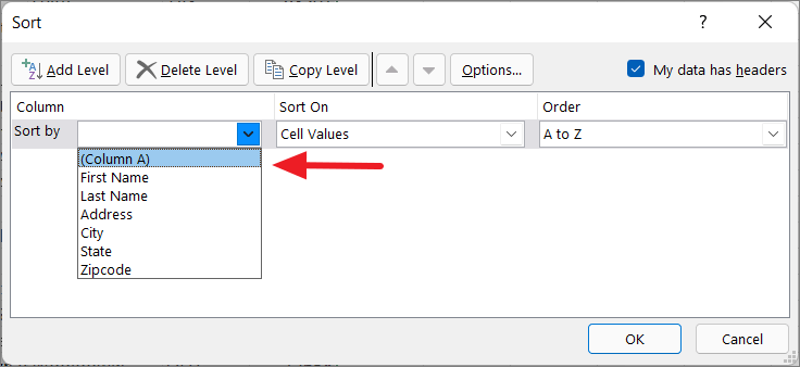 Step 6: Set the Sort by field to the new numbering column (e.g., Column A) and order it from Smallest to Largest. Click OK.