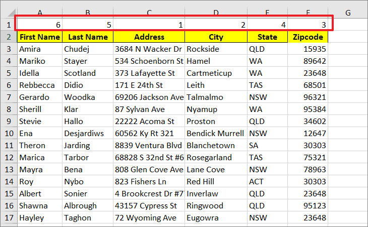 Step 2: In the new row, assign numbers to each column in the order you want them to appear.