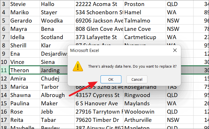 Step 4: Release the mouse button. If you're moving the row to a location that already contains data, Excel will prompt you with a message saying, "There's already data here. Do you want to replace it?" Click OK to confirm the replacement.