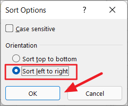 Step 5: In the Sort dialog box, click on Options and select Sort left to right.