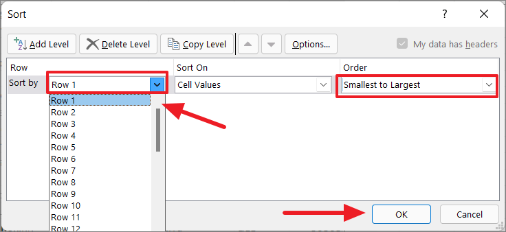 Step 6: Set the Sort by field to the new numbering row (e.g., Row 1) and order it from Smallest to Largest. Click OK.
