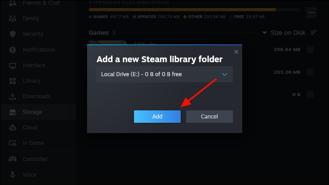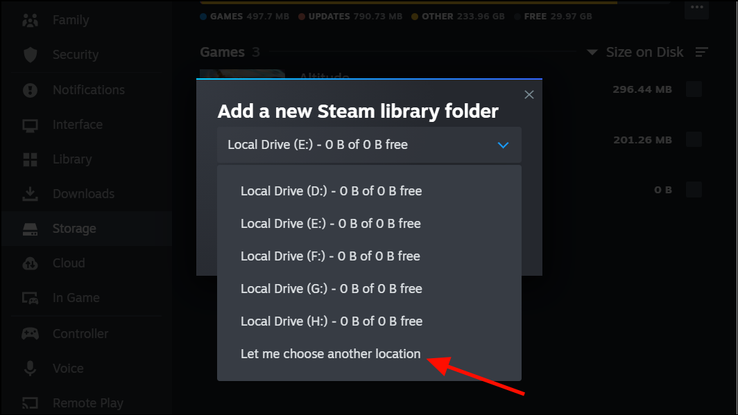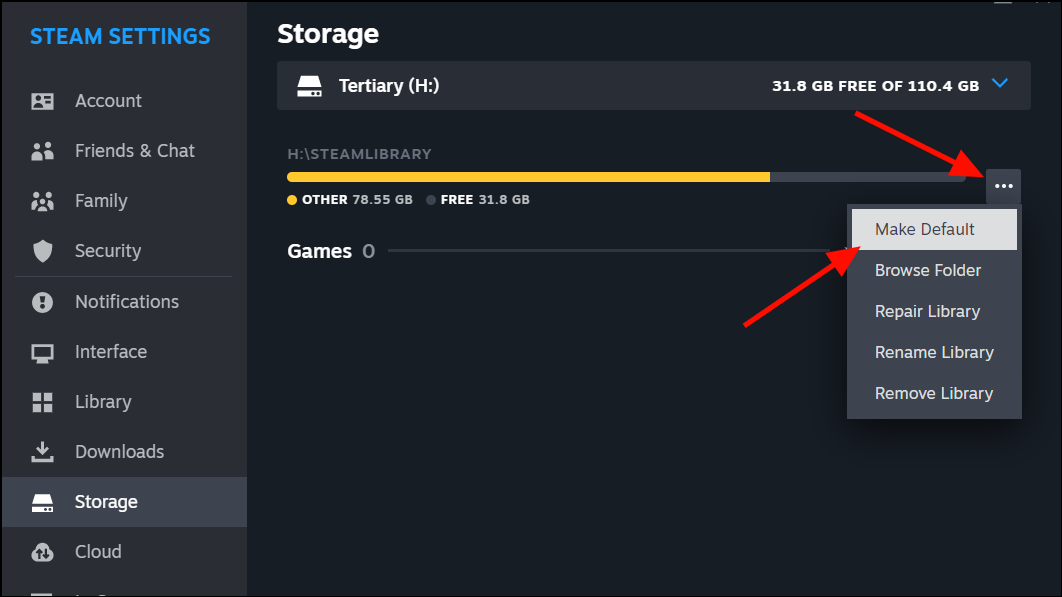 The first method is using the Storage settings, where we just created a new Steam library folder.