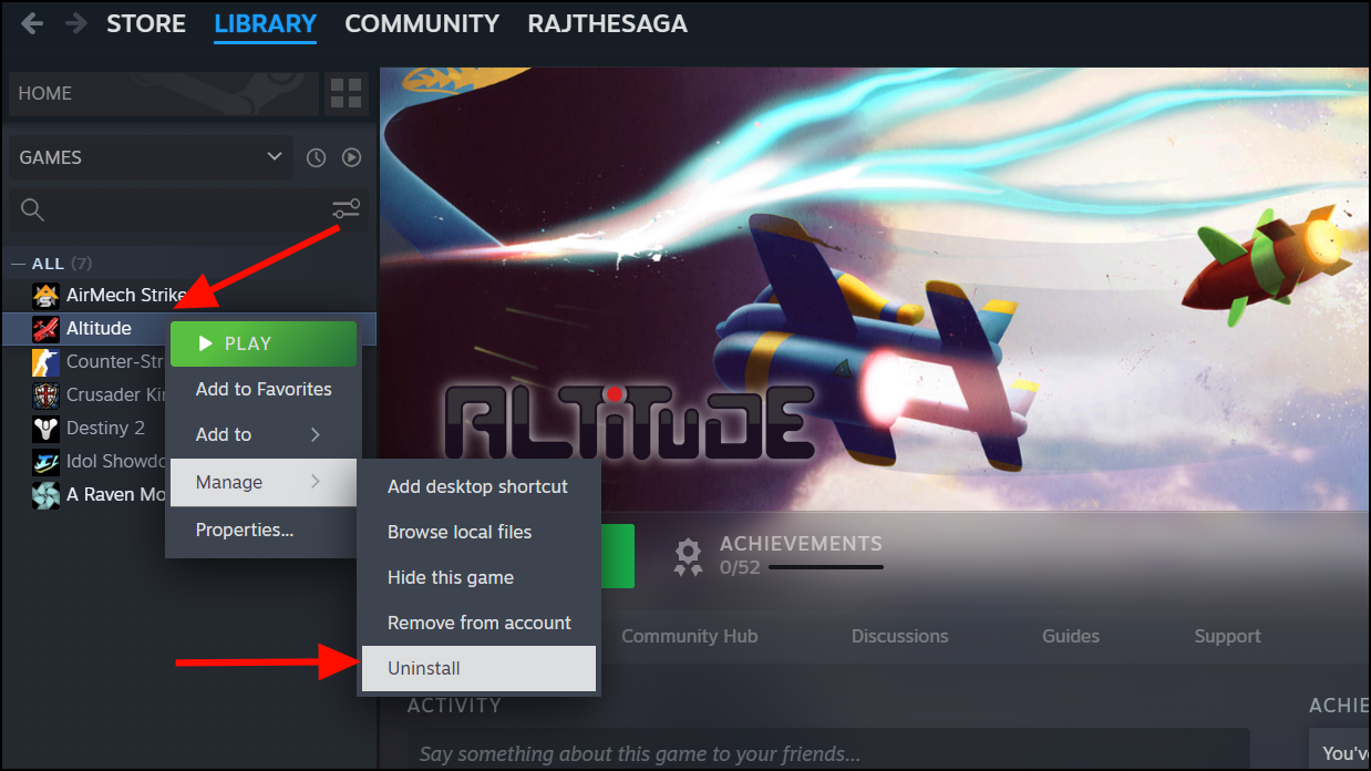 - After that, launch the Steam app. In your Library, right-click the games you moved to the new location and select 'Manage' > 'Uninstall'.