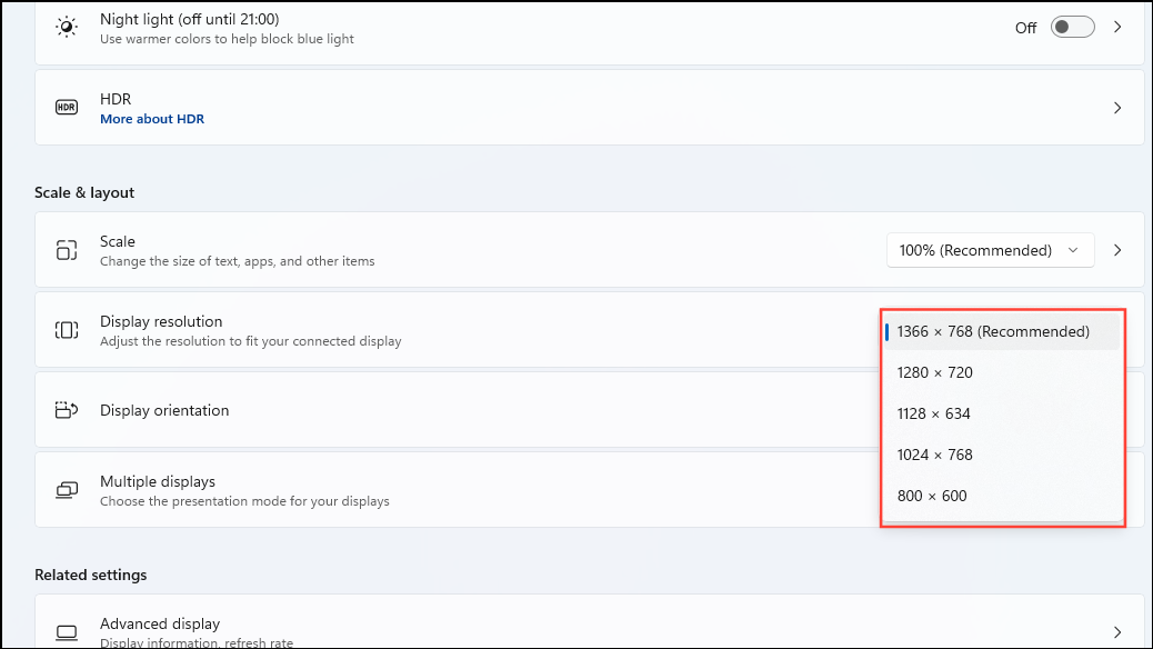 - Now click on the dropdown menu on the right of the 'Display resolution' option and change it to a different resolution temporarily.