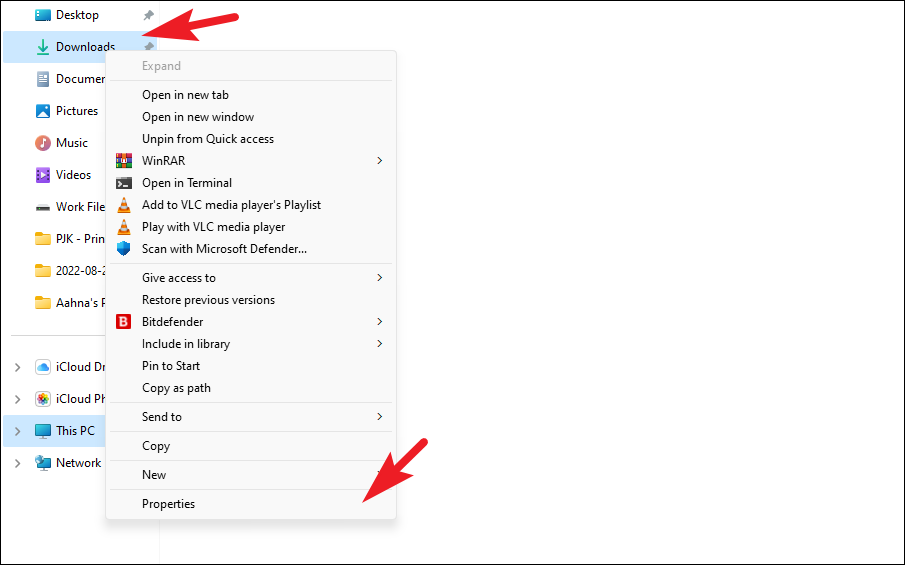Step 3: Go back to the main File Explorer window. Right-click on the original 'Downloads' folder (usually found under 'This PC') and select 'Properties' from the context menu.