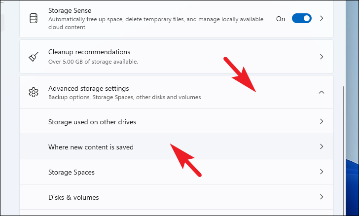Step 4: Scroll down and expand 'Advanced storage settings', then select 'Where new content is saved'.