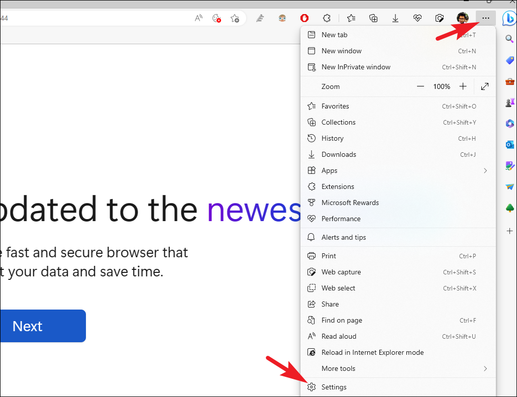 Step 1: Open Microsoft Edge, click the three-dot menu icon in the upper-right corner, and select 'Settings'.