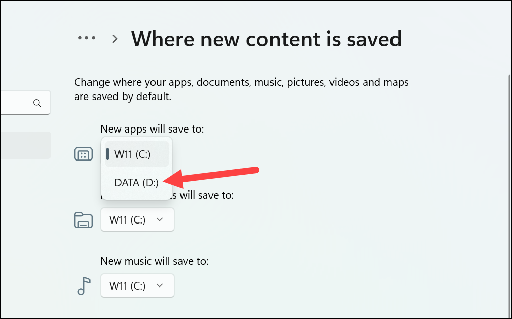Step 5: Under 'New apps will save to', click the drop-down menu and choose the drive where you want new apps from the Microsoft Store to be installed.
