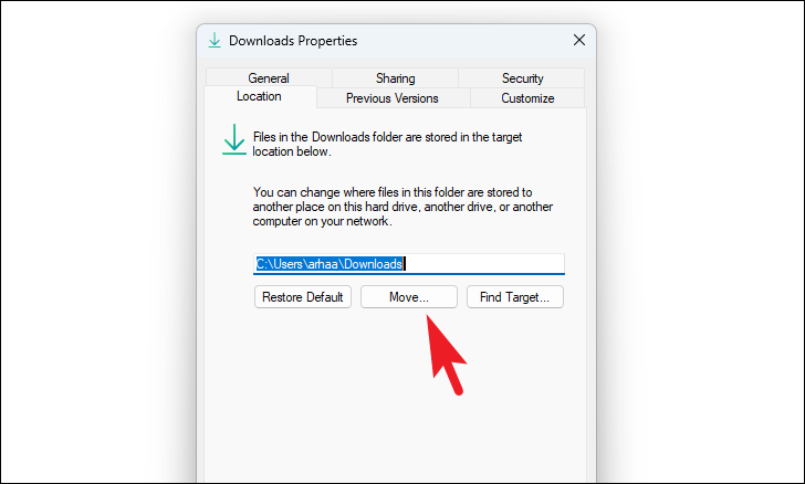 Step 4: In the 'Downloads Properties' window, navigate to the 'Location' tab and click on the 'Move' button. This will open a file selection window.