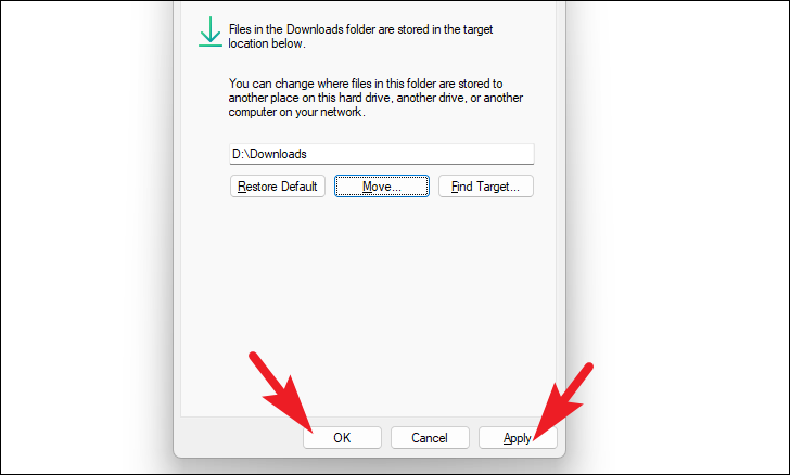 Note: If you want to revert to the default Downloads location in the future, open the 'Downloads Properties' window again, go to the 'Location' tab, and click 'Restore Default'.