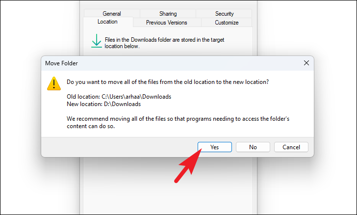 You may be prompted to move all existing files from the old Downloads folder to the new location. Click 'Yes' if you wish to transfer them, or 'No' to leave them in their original place.