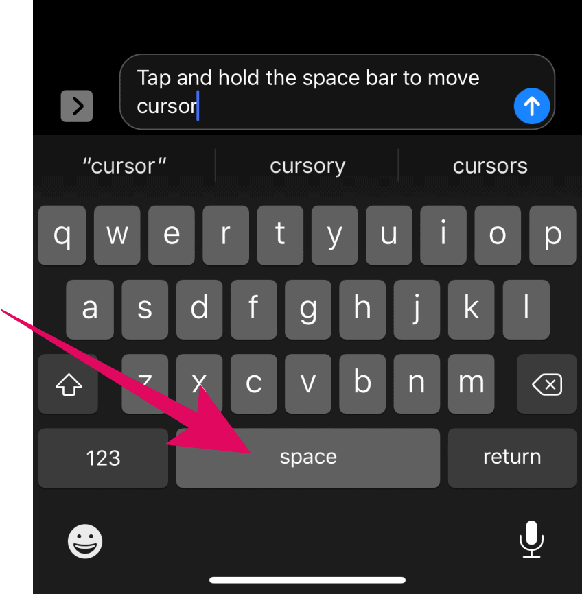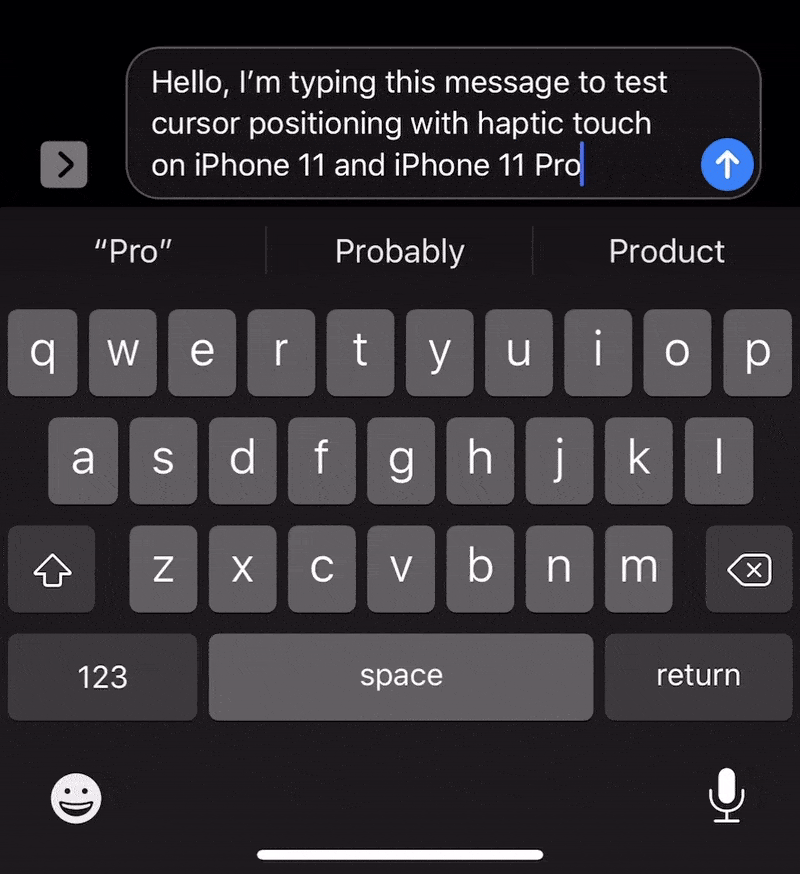 To move the cursor using Haptic Touch on iPhone 11 and iPhone 11 Pro, touch and hold your finger over the space bar on keyboard and then swipe it over the keyboard area to move the cursor in the text field area.