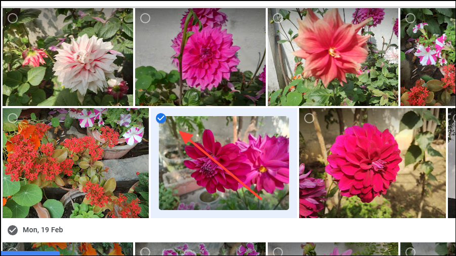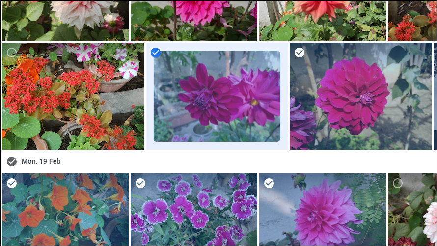 - Select the photos by moving your cursor over the photos you want to select and clicking the check mark that appears in each photo.