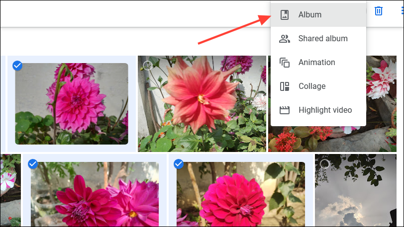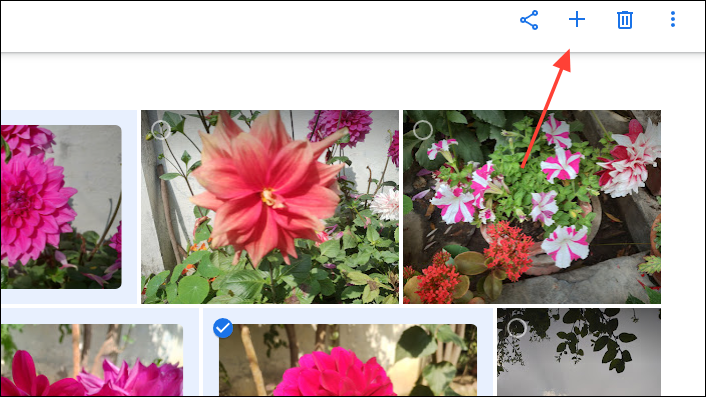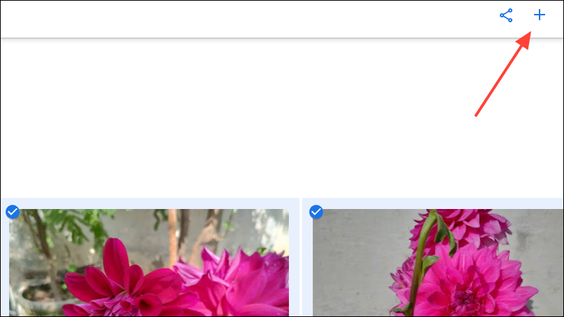 - To create an album, click the '+' sign on the top right after selecting the photos you want to share.