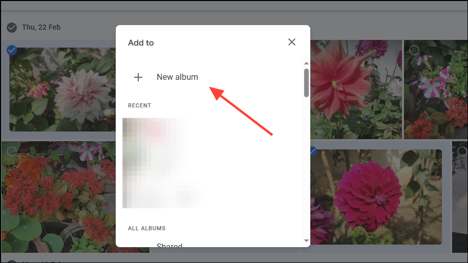 - You can move the photos to a new album or an existing one. For transferring photos to your second account, click the 'New Album' option.