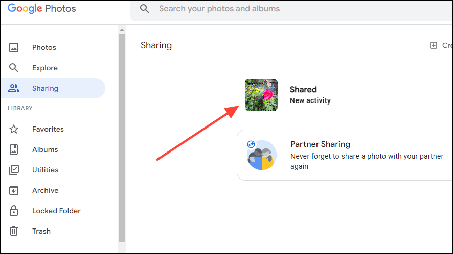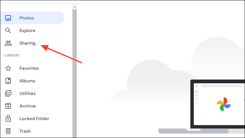 - Now, log in to your other Google Photos account and click the 'Sharing' option on the left side.