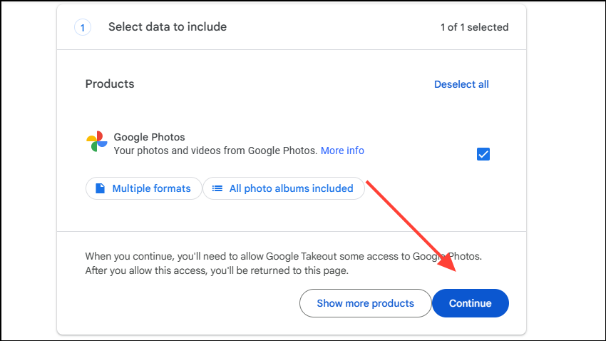 - Google Takeout will open in a new tab and will select Google Photos for backing up data. Click the 'Continue' button to proceed.