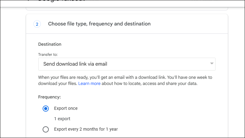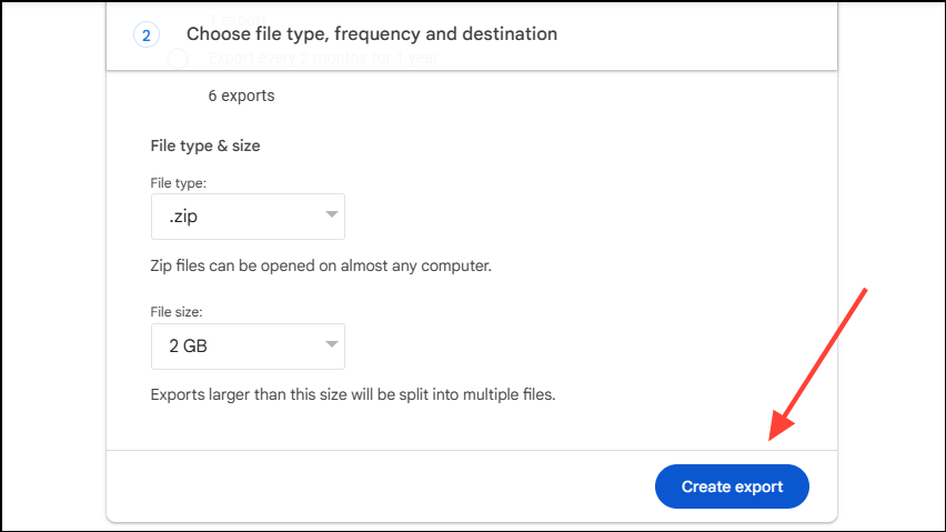 - This will allow you to choose the export frequency, type, and destination. You can choose to export just once or export every two months for one year as .zip or .tgz extensions.