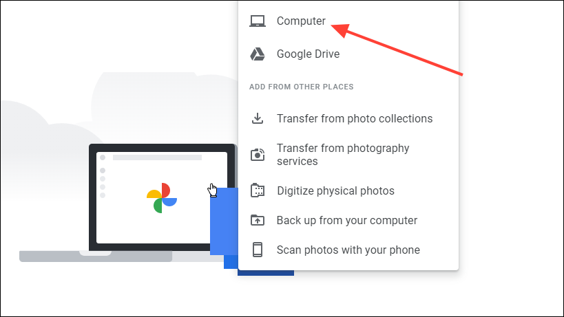 - When you click the 'Upload' button, you can select from where you want to upload the photos. Click on 'Computer' and navigate to the folder with the downloaded photos.