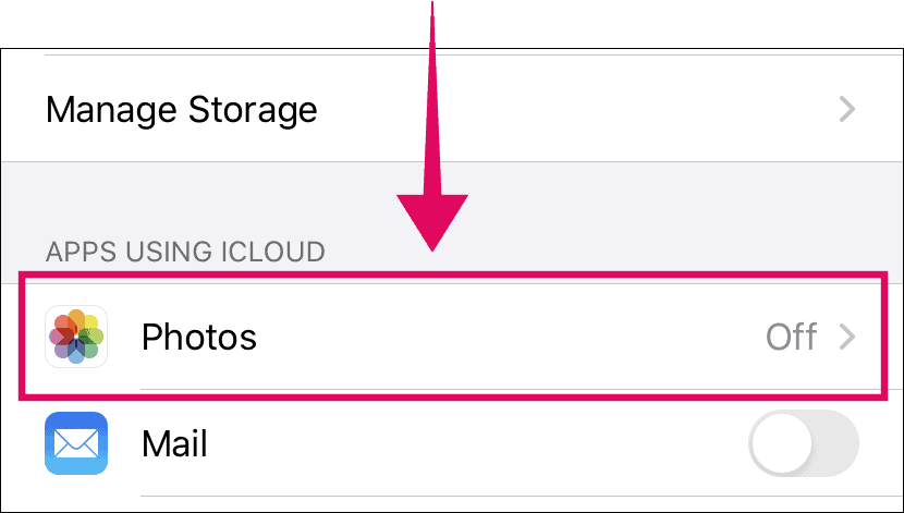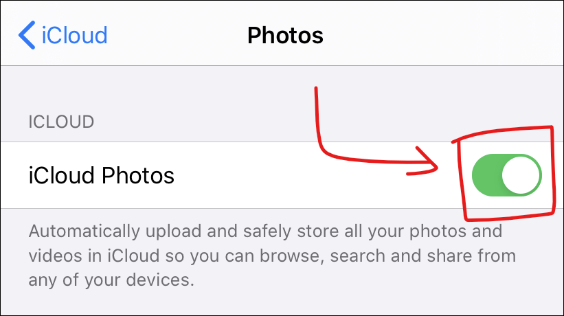 Then finally, turn on the toggle swtich for iCloud Photos option to ennable automatic backup of photos and videos from your iPhone to iCloud when connnected to a Wi-Fi network.