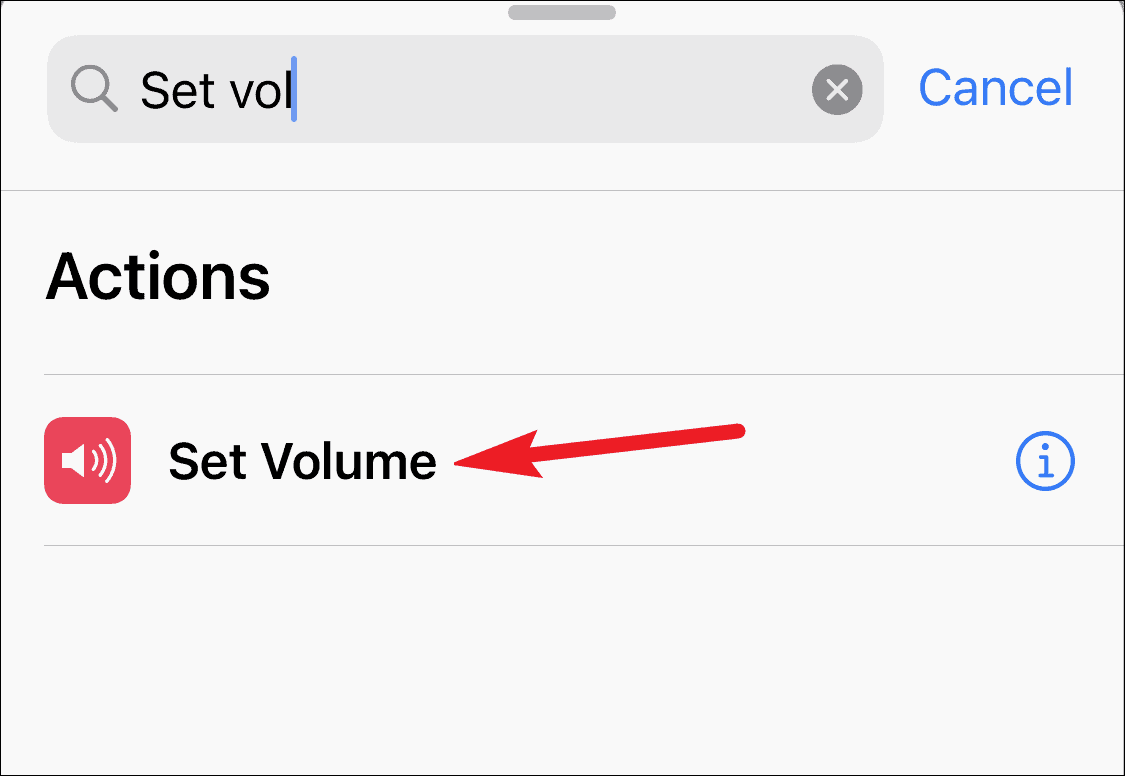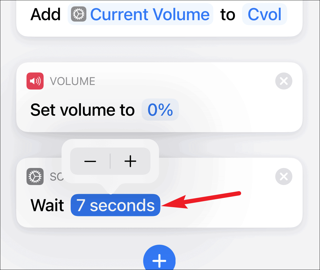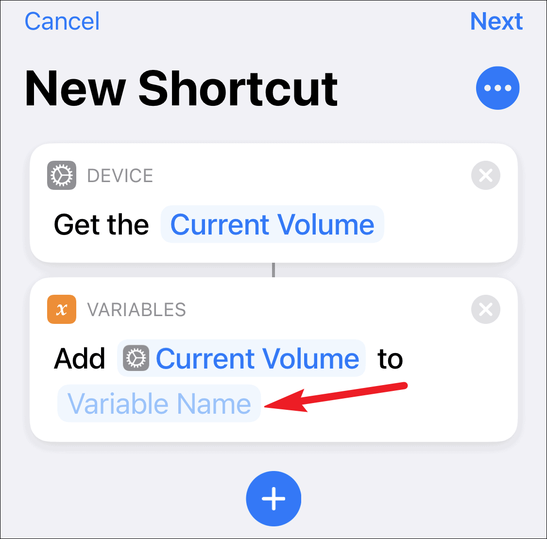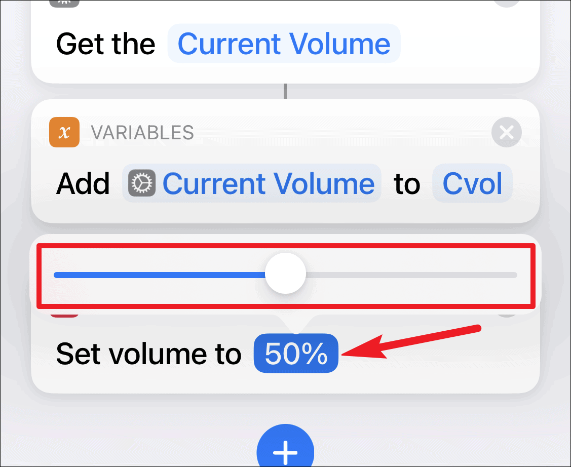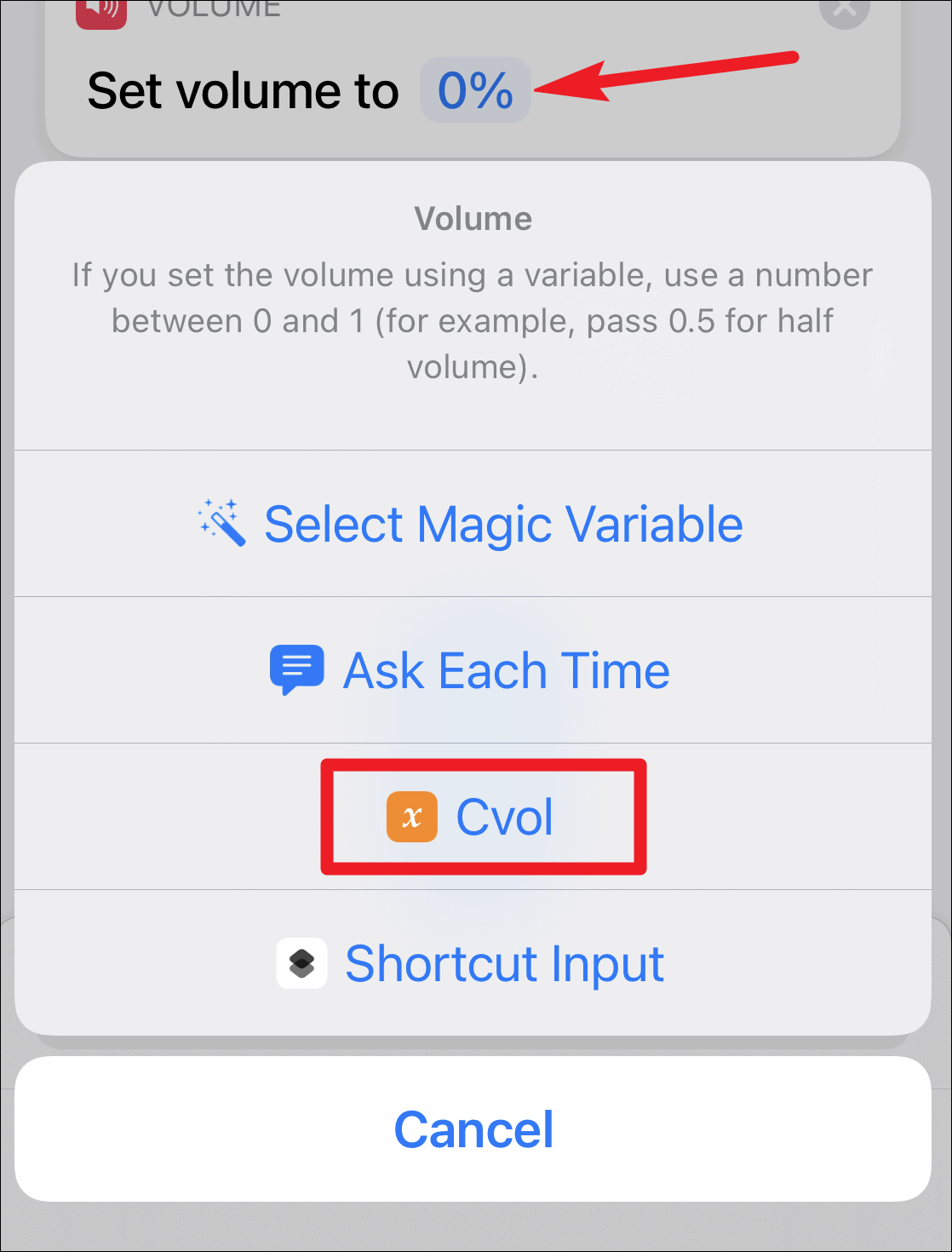 Now, add another ‘Set Volume’ action. Tap and hold the number it’s currently displaying. A few options will pop-up on your screen. Select ‘Cvol’ from the list.