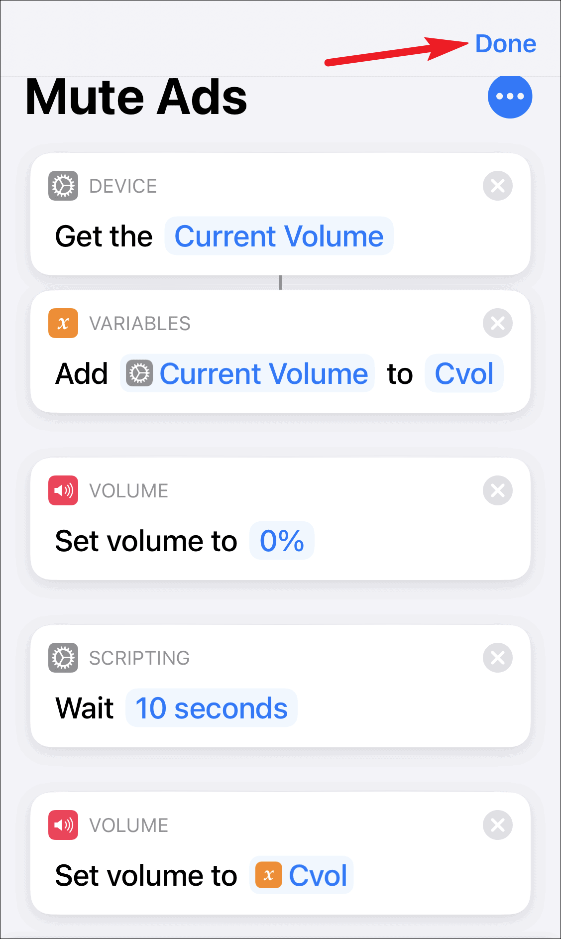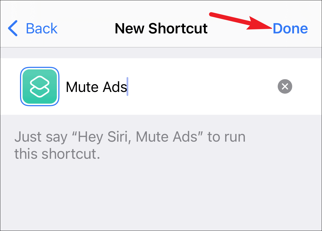 It’ll ask you to enter a name for the shortcut. Enter something that’ll make it easy to identify the shortcut later. Here, we’ve entered ‘Mute Ads’. Now, tap on ‘Done’ to save the shortcut.