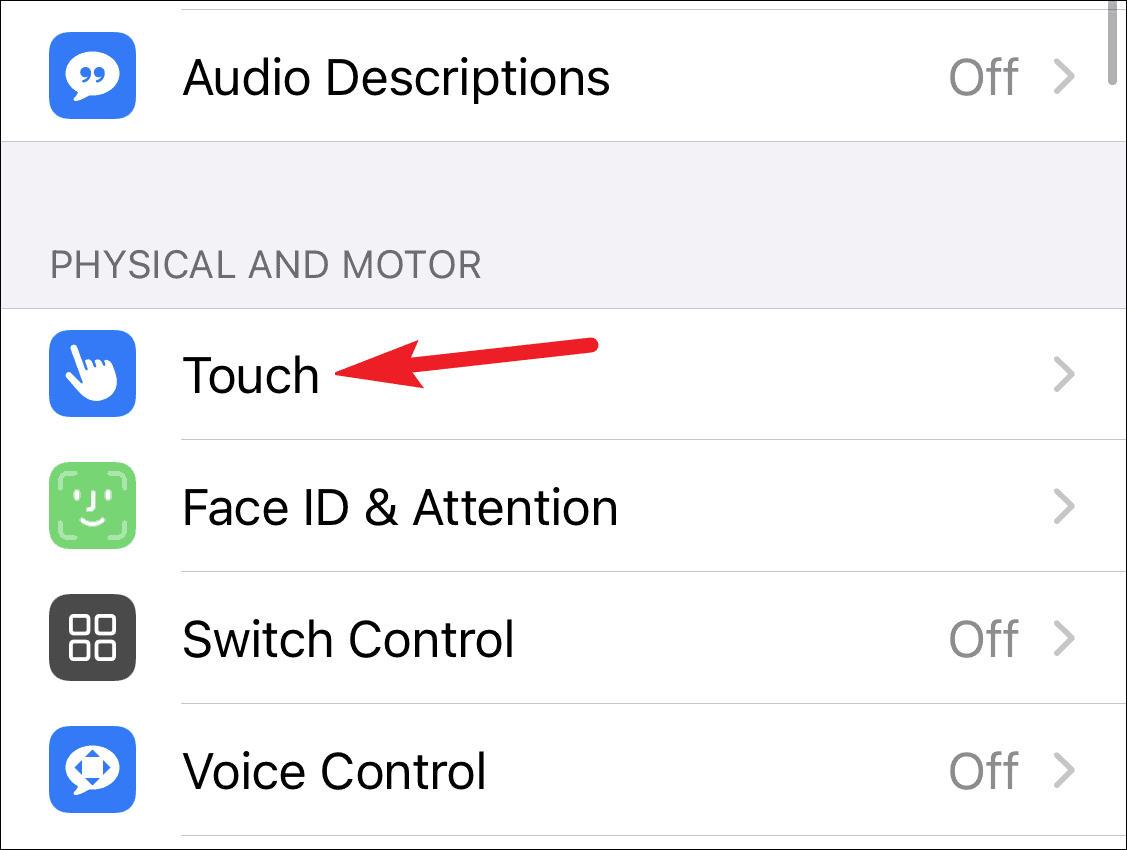 In the accessibility settings, tap the ‘Touch’ option under the Physical and Motor settings.