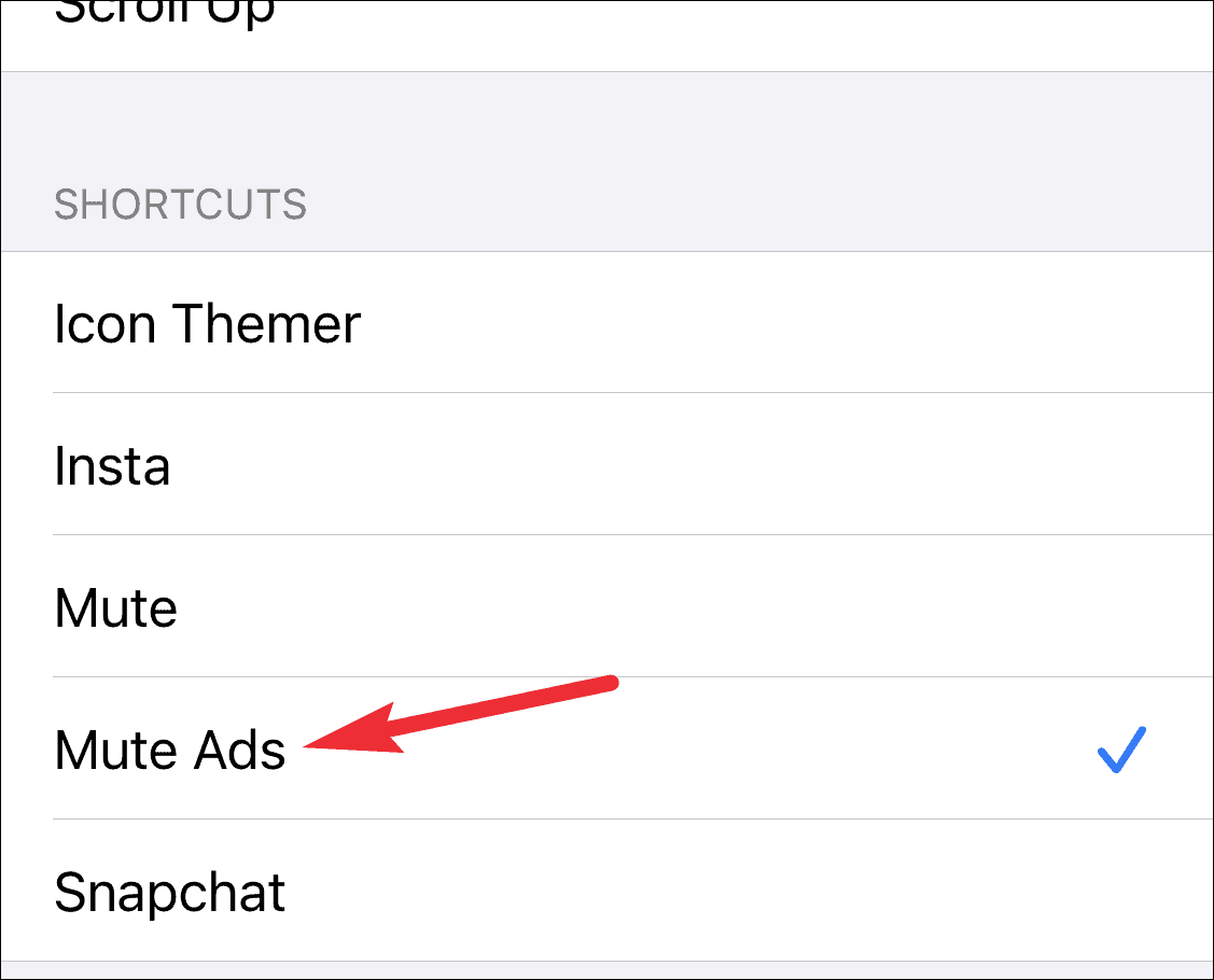 Then, scroll down to the very end and you’ll find the option for Shortcuts. Tap on ‘Mute Ads’ (or whatever you chose to name it) to select it.