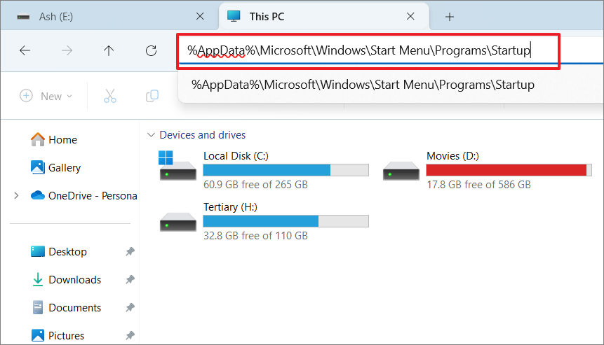 To find the Startup folder for your individual user account, open File Explorer paste the following path into the address bar, and press Enter,: