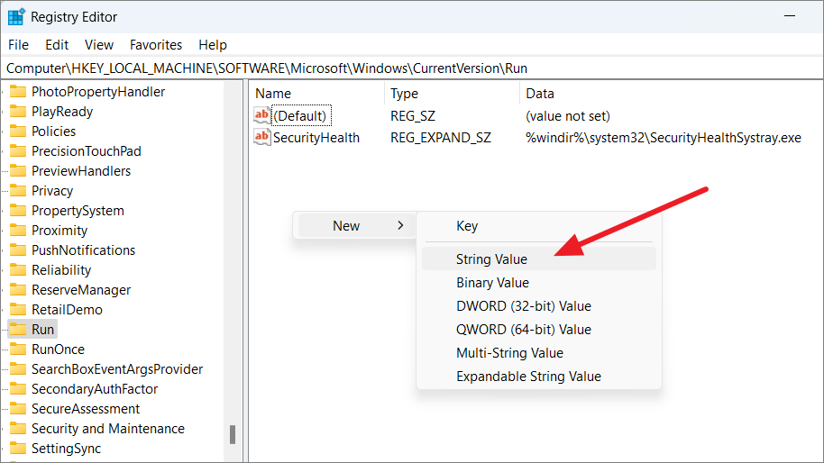 - Right-click in an empty area, choose ‘New’, and then select the ‘String Value’ option.