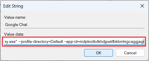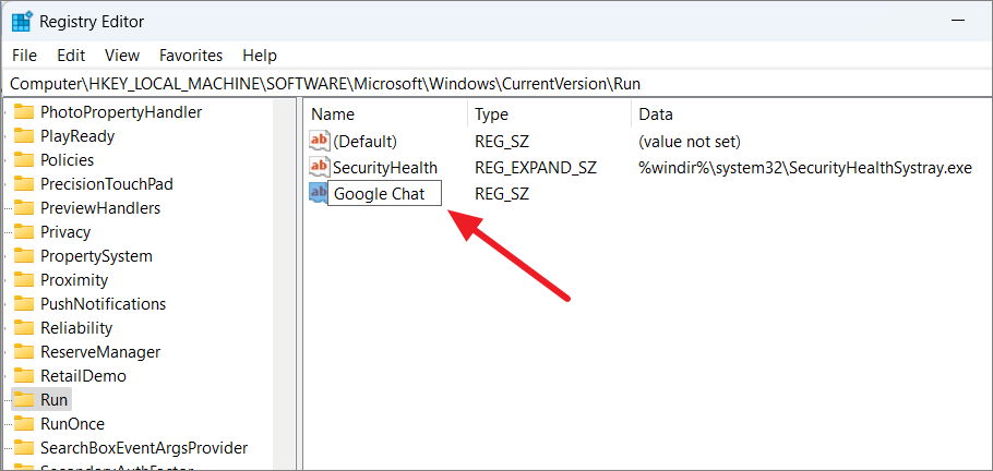 - Rename the newly created string value to the name of the program you want to add to the startup. For example, if you want to add Google Chat to the startup, name the String Value 'Google Chat'.