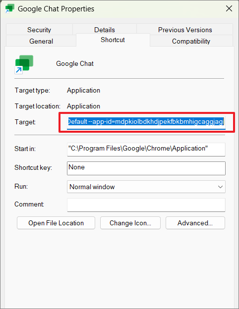 - First, you need to copy the app location as we did in the above method. Right-click on the web app's shortcut icon and select ‘Properties’. In the below example, we want to add ‘Google Chat’ to the startup.