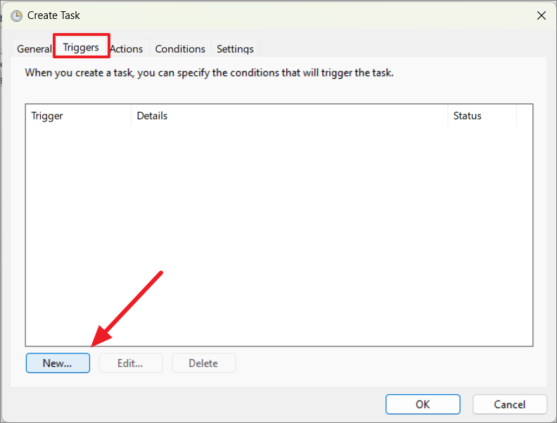 - Next, switch to the 'Triggers' tab and click the 'New' button below.