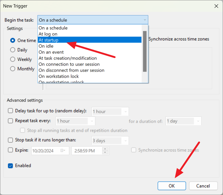 8. In the 'Begin the task' dropdown, select 'At startup' and click 'OK'.