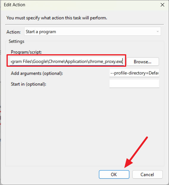- In the New Action dialog box that pops up, paste the application's location you copied from the app's properties into the 'Program/script' field, and click 'OK'. Make sure to remove the double quotes from the path (" ").