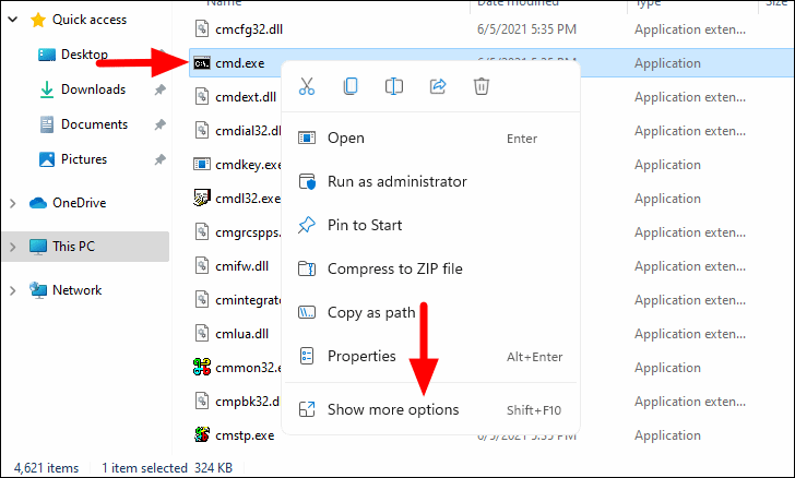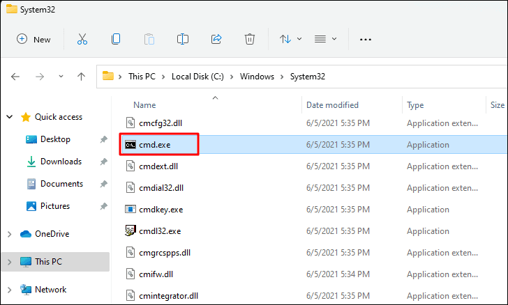 C:\Windows\System32- Scroll down and locate cmd.exe.