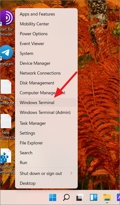 - Open Windows Terminal by right-clicking the Start button on the taskbar and selecting Windows Terminal.