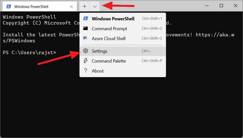 - In Windows Terminal, click the downward arrow next to the plus tab button and choose Settings.