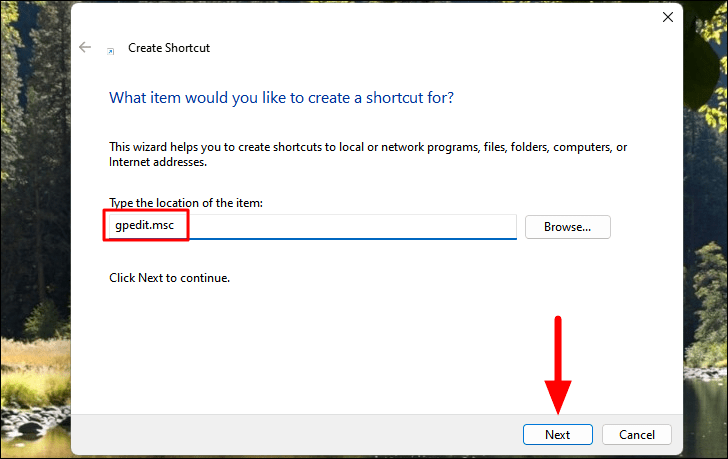 gpedit.mscin the text field and click Next.