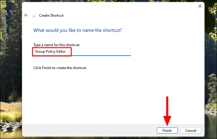 - Enter a name for the shortcut (e.g., Group Policy Editor) and click Finish.