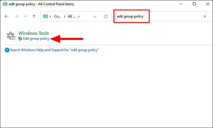Edit group policyin the search bar at the top. - Select the relevant search result to open the Group Policy Editor.