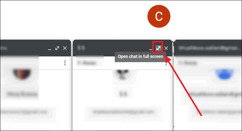 If you find the need to blow a chat pop-up to a full-screen and onto the Google Chat ‘main window’, here’s what you do. Click the ‘Open chat in fullscreen’ button shown with a double-headed northeast-facing arrow at the top-right corner of the chat pop-up.
