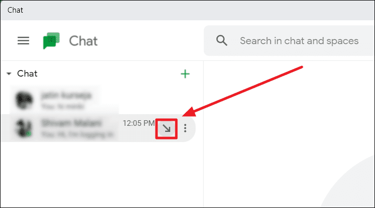 First, launch Google Chat on your computer. If you’re already on a conversation and want to pop up a different one, just look to the left of your screen – the ‘Chat’ section. Hover your cursor over the chat you want to pop up. You will see a southeast pointing arrow at the bottom-right corner of the chat tile. This is the ‘Open in a pop-up’ button. Click it.