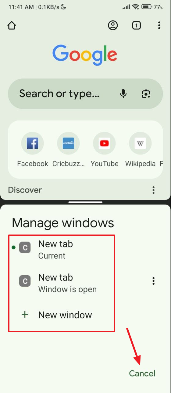 - Tap on 'Manage windows' to switch between all open Chrome windows, open a new window, or close an open one. Tap on the 'Cancel' option in the bottom right to go back to your current window.