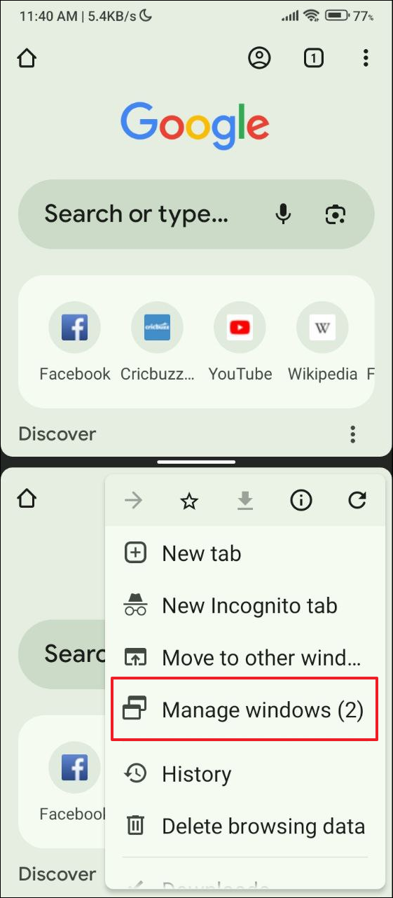 - You cannot open multiple Chrome windows without opening the app in split-screen mode first. The 'Manage windows' option does not appear if you have a single instance of the app running on your phone.