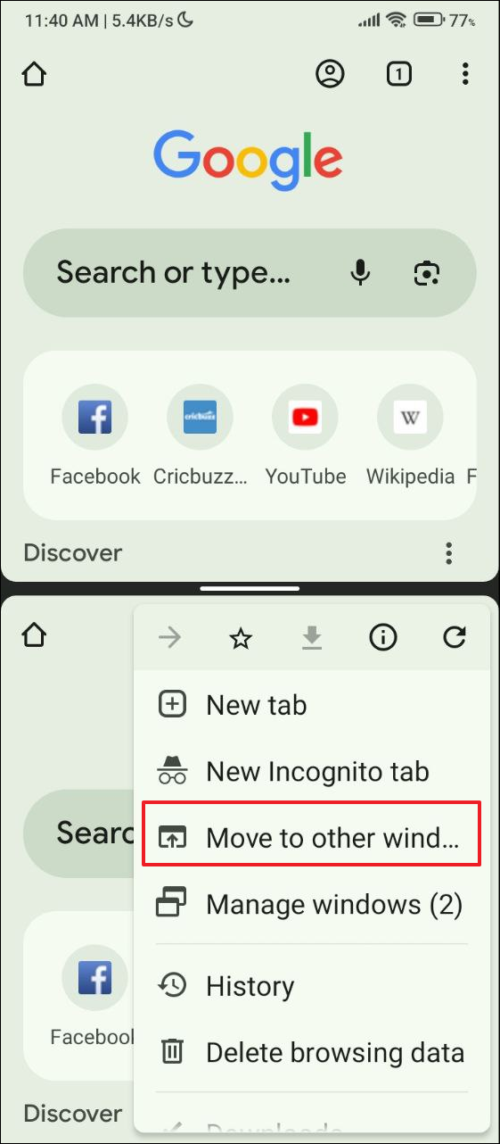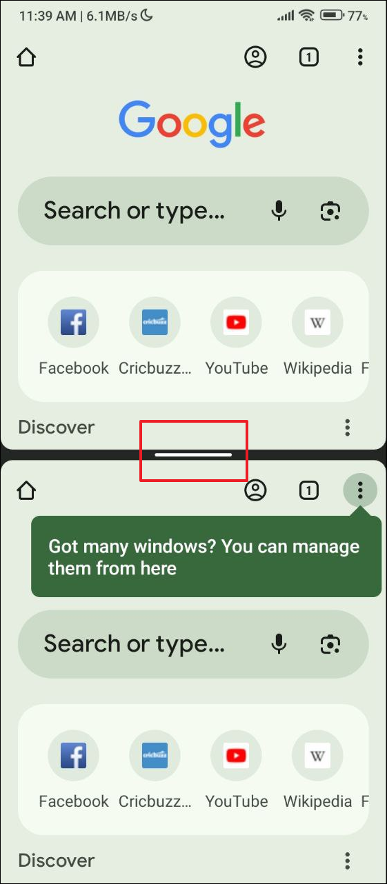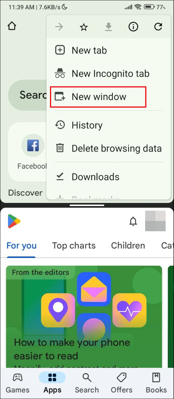 - When you tap on the 'New window' option, a new Chrome window will open in the bottom half, replacing the second app you opened. You can change the size of the Chrome windows by tapping and holding the middle bar.
