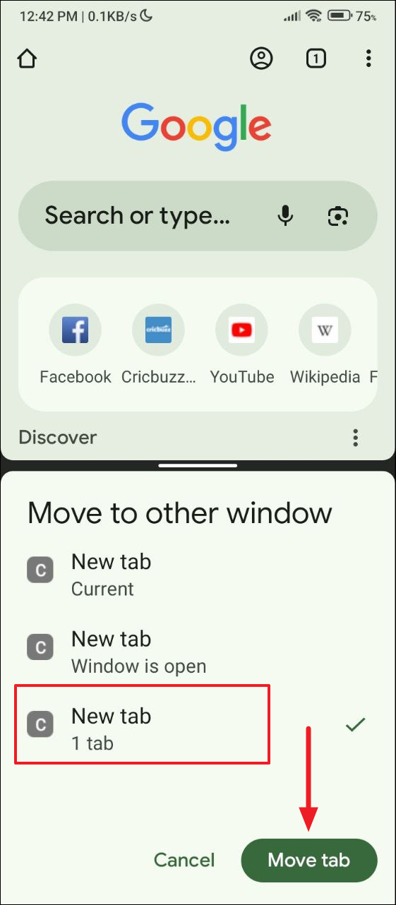 - You can also move your currently open tab to another Chrome window by tapping on the 'Move to other window' option.