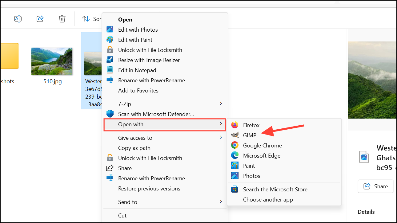 - Once Gimp is installed, navigate to your WebP image in Windows Explorer, right-click it, and select Gimp from the Open with option.