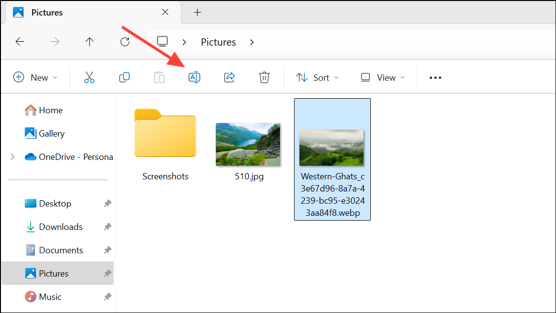 - Click the WebP image and then click the Rename button in the File Explorer window.